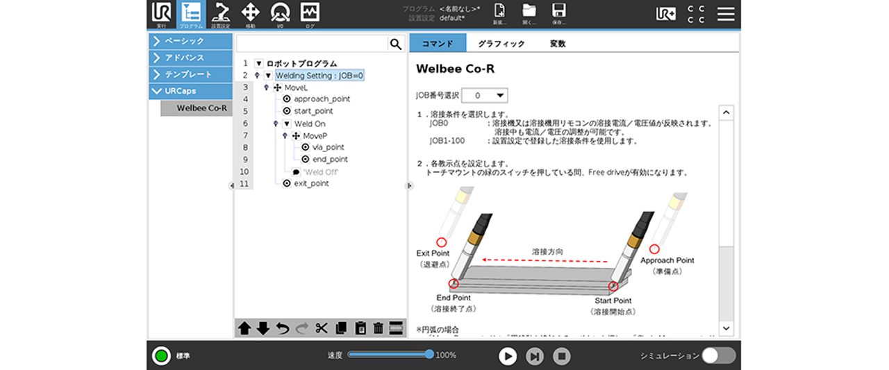 溶接条件を設定する画面は、必要な機能を集約した。ティーチペンダントにある「Welbee Co-R」ボタンをクリックするだけで、溶接プログラムの基礎となる10個のコマンド(溶接開始指示、溶接開始・終了位置など)が表示され、初心者でも説明書なしでプログラムの作成ができるようにした。