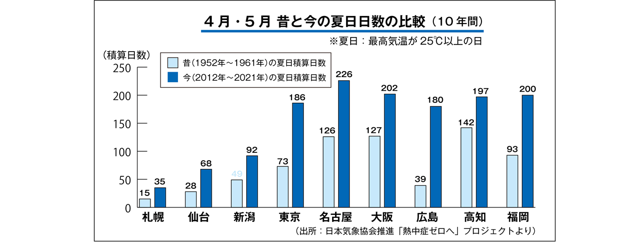 気象庁によると、6〜8月の平均気温は100年あたり1.16℃の割合で上昇しているという。気温が上昇しはじめるタイミングも早く、4、5月に夏日(最高気温25℃以上)を観測する日数も増加。東京を例に取ると、1952〜61年の10年間と2012~21年の10年間の夏日の積算を比べたところ、73日から186日とおよそ2.5倍に増加(日本気象協会調べ)。大阪でもおよそ1.5倍となるなど、近ごろ「日本から春が消えた」と言われるのも頷ける結果だ。いずれにせよ日本の夏は全国的に長く、そして暑くなる傾向にある。