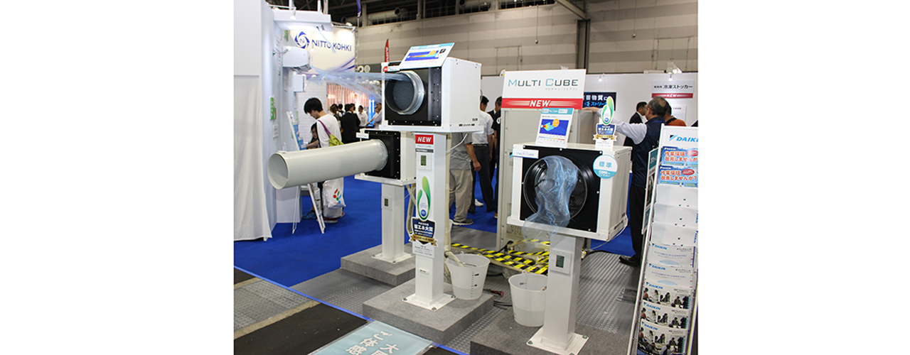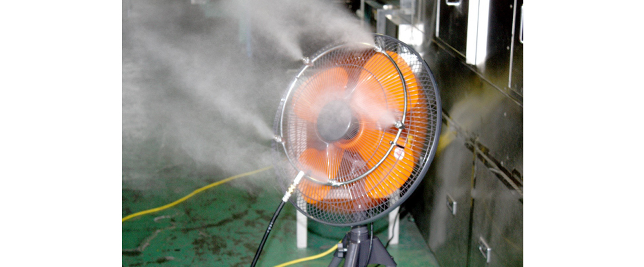 冷たい風を生み出すわけではなく、あくまで気化熱を利用。担当者は「エアコンほどの冷却効果はないが…」と前置きして言葉を続ける。「天井の高い大型工場など、エアコンが効きにくい現場でお役に立てる。視覚的にも涼しく、福利厚生の一環として半屋外の休憩エリアなどに使っていただくのも効果的。要は適材適所で、開放的な空間など刺さる現場には深く刺さる製品」(推進部推進課)