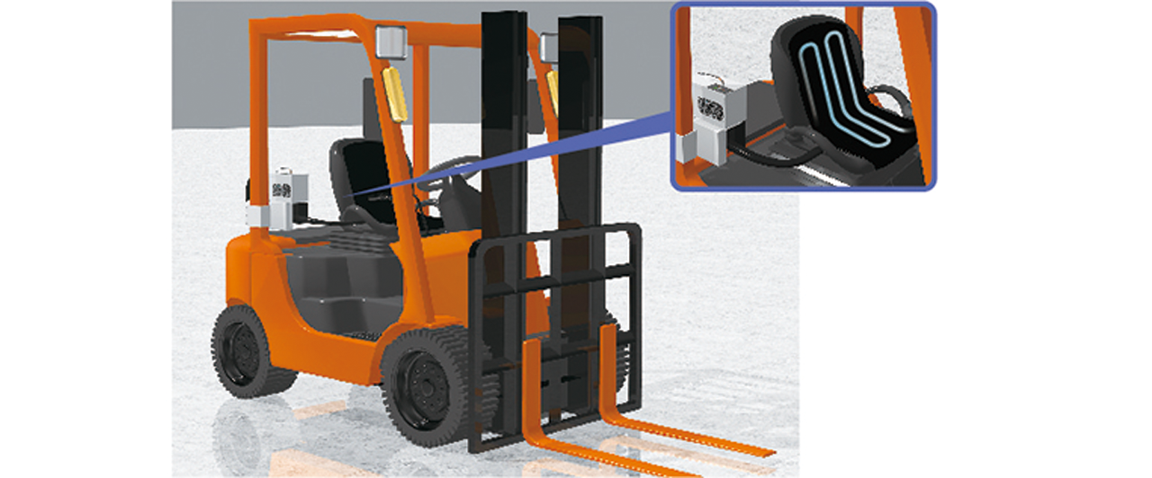 搭載したフォーク専用チラーには、独自に開発した振動対策を実装(振動・衝撃試験:MIL-STD-810適合)。小型チラーで生成した冷水を座席に設置した冷却シートに循環し、「冷える座面」で熱がこもりやすい背中・尻・太もも裏をダイレクトに冷却する。45℃までの酷暑環境に対応し、外気風の影響を受けることなく走行中にも確実な冷却機能を発揮できるという。