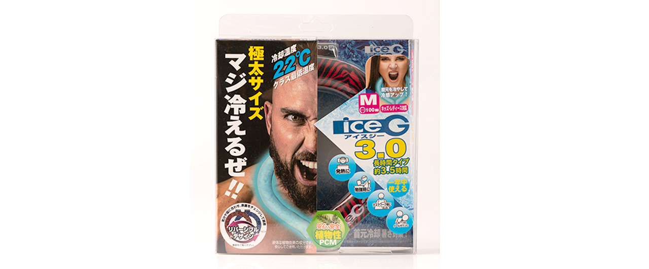 「マジ冷えるぜ‼」と迫真の表情でこちらを見る男性。昨夏発売の冷却グッズ「ICEG(アイスジー)」のパッケージを見ると、思わずその機能を試してみたくなる。
