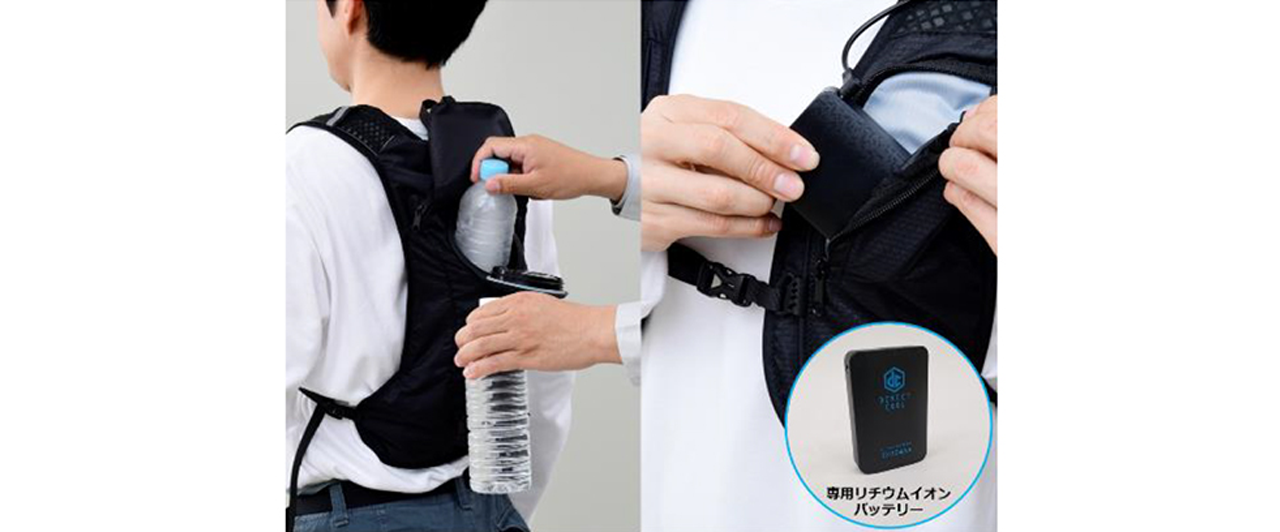 山善が提案する新発売の水冷式ウエア「DIRECT COOL」シリーズ。凍らせたペットボトルで冷やした水を、専用のリチウムイオンバッテリーを用いた小型電動ポンプで循環させることで、体をダイレクトに冷やす仕組みだ。