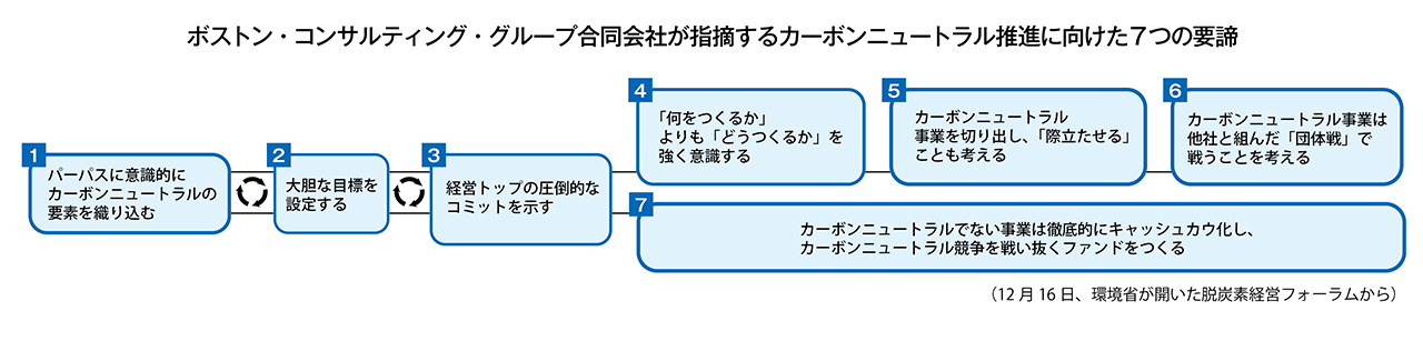 ただ、カーボンニュートラル経営の推進は難しい。丹羽氏は難しい理由として「影響範囲が広く、複雑で不透明で、時間軸が長い」ことを挙げる。うまく進めるには大胆な目標設定や経営トップのコミットメントなど7つの要諦があると説く。