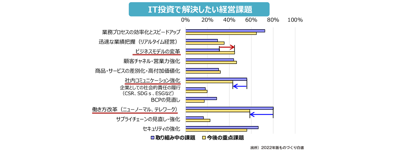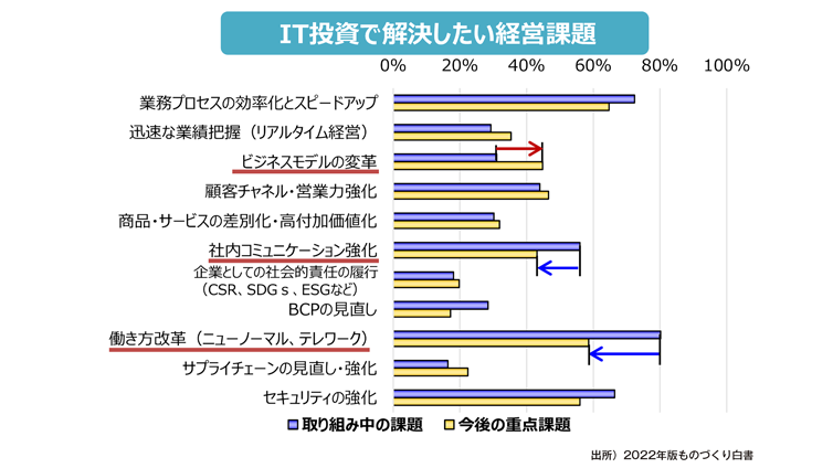 製造業のIT投資は現状ほぼ横ばいのようだが、そんななかにも白書は「経営者の意識の変化がうかがえる」と記した。上のグラフにあらわれているように、IT投資で解決したい経営課題は、取組み中の課題としては「働き方改革」が1位、次に「業務プロセスの効率化とスピードアップ」と続いたが、今後の重点課題には「ビジネスモデルの変革」が挙がった。DXの時代といわれるなか、その課題を解決するインフラは急激に整いつつあり、デジタル人材を据えて成果につなげていきたい。