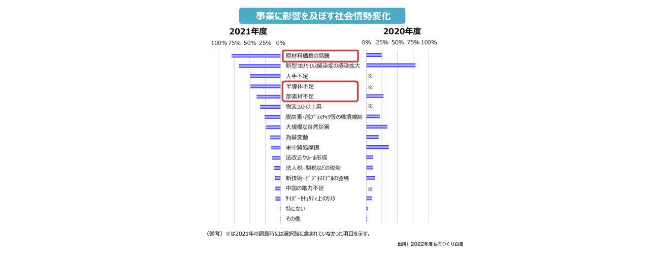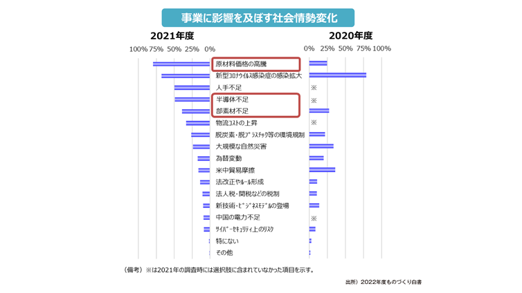 しかし生産面で表出した停滞感に対し、設備投資は20年前半に大きく落ち込んだあと回復に向かい「足下でも回復傾向」と明確に捉えた。シンクタンクの調査などを元に「今後3年間の国内外の設備投資も、引き続き増加見込み」と述べている。もっとも、社会情勢の変化の激しさから不透明感も根強いようだ。特に「原材料価格の高騰」「半導体不足」「部素材不足」の影響が大きく増していることに白書は目を向けている。