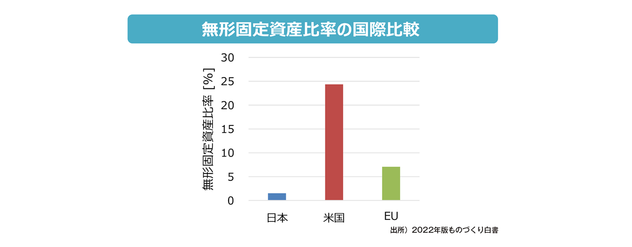 他方、製造業企業を日本・米国・EUで国際比較すると、日本は営業利益率で米国・EUより低く、研究開発費比率でも最下位にあった(2017年~20年度の平均値で比較)。さらに無形固定資産(※)の比率は日本が極端に低く、米国の10分の1、EUの4分の1水準に過ぎない。国際競争力の源泉として特にデジタル化の進む昨今は年を追って「無形資産」の重要性が増しており、白書は行間に強い懸念をにじませている。