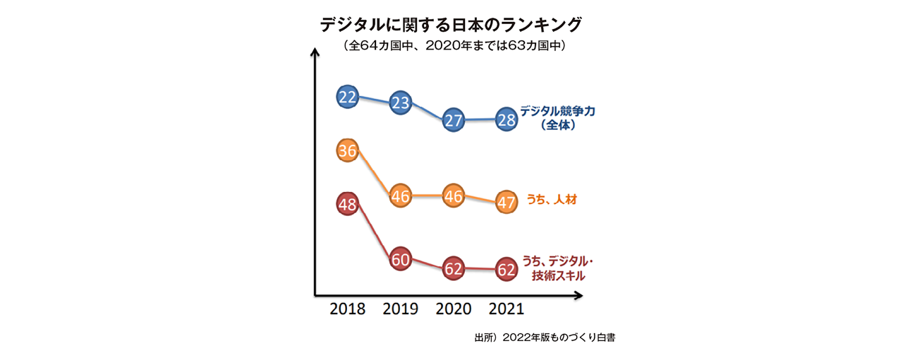 残念ながら我が国のデジタル推進人材は「量」「質」ともに不足しているのが現状であり、スイスの国際経営開発研究所が公表した「世界デジタル競争力ランキング2021」では日本のデジタル競争力は64カ国中28位であり、さらに「デジタル・技術スキル」にいたっては62位とほぼ最下位の結果だった。「高度デジタル人材の養成」は待った無しの課題と同時に深刻な問題になっている。白書は人材育成に向けた国の、学の、また個別企業の取組み例を紹介するが、これらが響くかどうか。