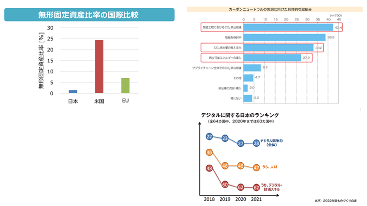 今年のものづくり白書は、ほぼ全編を通じ「事業環境の変化」というテーマ視点を堅持して綴られている。ここでいう「事業環境の変化」とはコロナ感染症の直接間接の影響から部素材不足、原油価格の高騰、ロシアウクライナ問題など多岐にわたるが、白書は特に、多くの企業が取組み強化の動きにある「カーボンニュートラル(以下CN)」と「DX(デジタルトランスフォーメーション)」に関する記述にページを割いた。あわせて、こうした取組みに必要な人材育成の必要性を強調した。