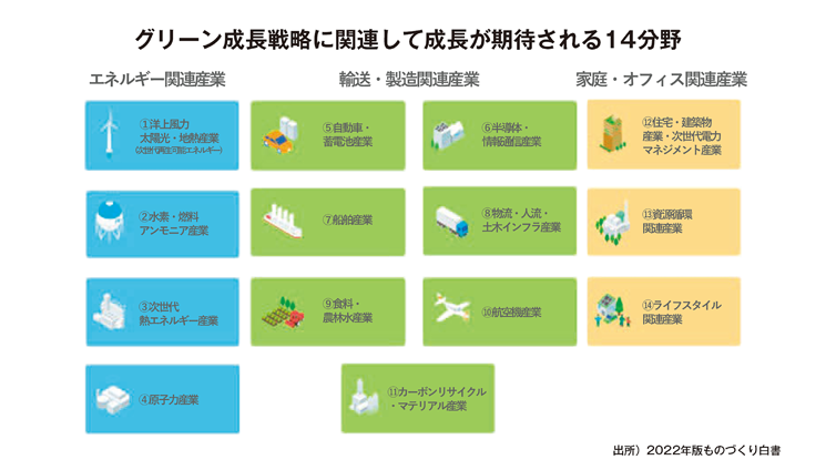 CNの実現には、民間企業等の従来のビジネスモデルや戦略を抜本的に見直す必要がある。そのハードルを乗り越えるためには、国として可能な限り具体的な見通しを示し、高い目標を掲げ、挑戦しやすい環境を整えることが必要である。グリーン成長戦略では、今後期待される14分野と各分野で目指すべき高い目標を示した上で、予算、税、規制改革・標準化、民間の資金誘導など様々な政策を総動員して民間企業等の取組みを後押ししていくこととしている」(以上、原文ママ)。