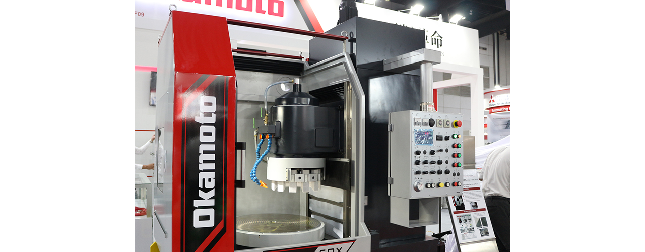 他にも新製品として立軸ロータリー平面研削盤「VRG-DX series」を海外初お披露目。立軸のといし軸搭載により、高能率加工を実現、生産性を求めるニーズに応える。また、標準で回転テーブルフットスイッチを搭載。操作性を大幅に向上させた。ガラスやセラミックなどの脆性材加工にも向く。