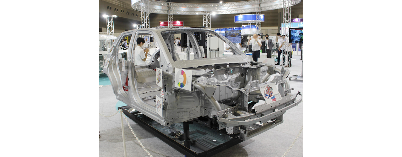 ホンダ初のEVである都市型コミューター「Honda e」には軽量化と高剛性化のため車体には超ハイテン材が多く使われている。座席周りの保護ゾーンには780M~1180MPa材やHOTSTAMP材を使用(2022年7月に東京で開かれた「2022国際ウエルディングショー」から)