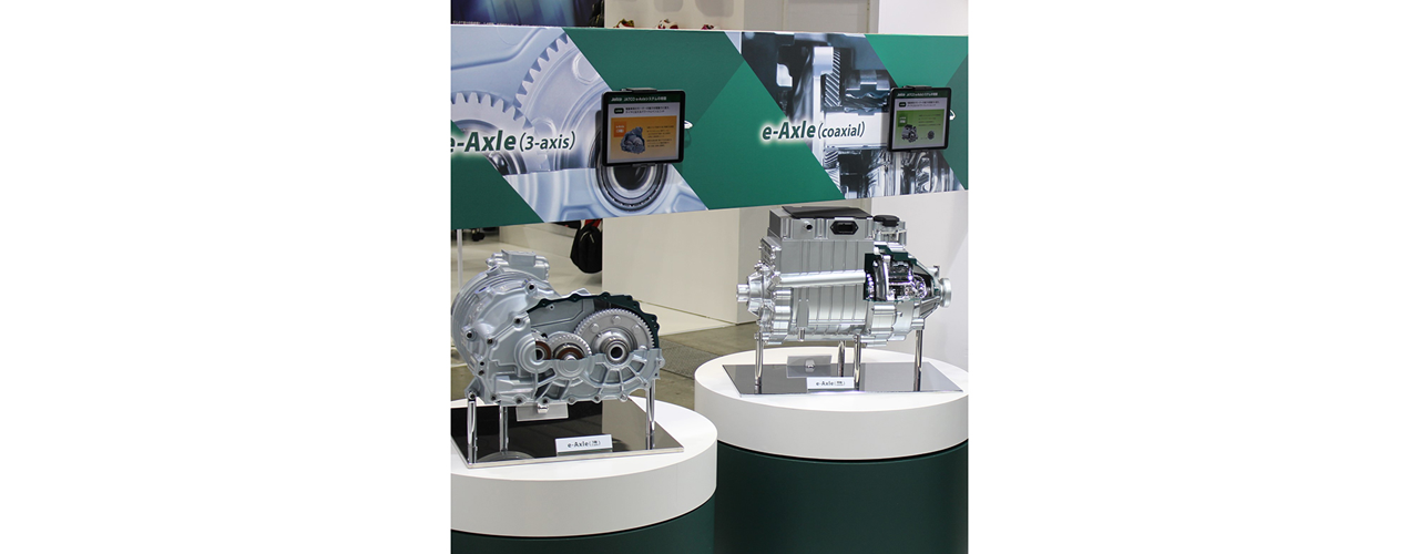 電動駆動システム「電動アクスル」はモーターやインバーター、ギアボックス(減速機と差動歯車装置〈デフ〉)からなる。CVT(無段変速機)市場で世界首位のジヤトコの佐藤朋由社長は電動アクスル2種を披露し、「2025年までに電動アクスル市場に参入し、30年までに500万台の販売を目指す」と話す(2022年5月に横浜市で開かれた「人とくるまのテクノロジー展2022 YOKOHAMA」から)