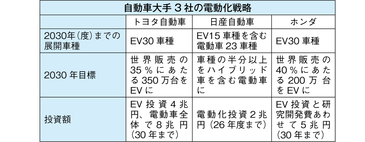 自動車大手のEVシフトが一段と加速している。ホンダは今春、EVの開発や生産設備に30年までに計5兆円を投じると発表した。40年までに全車種をEVとFCV(燃料電池車)にする、日本勢で最も踏み込んだ目標を掲げた。
