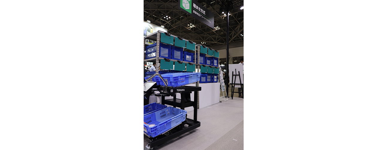 寺岡精工は得意の秤の技術を用いて、トータルピッキング(種まき方式)とオーダーピッキング(摘み取り方式)双方に対して、ピッキングカートを活用したシステムを提案した。初披露となった「重量検品アソートシステム」は重量減算式ピッキングカートとシャッターアソートシステム(SAS)を組み合わせたもの。種まきエリアにカートを移動させるとRFIDと連携したSASのシャッターが必要な部分のみが開くため入れ違いを防止。商品投入の際にはカートに内蔵された計量器を使って数量チェックを行うため、検品作業を省力化できる。摘み取り方式で提案された自律走行式のピッキングカート(AMR)は作業者の移動距離を短くするだけでなく、計量器を内蔵しているため前述のシステム同様に検品作業の省力化につながる。