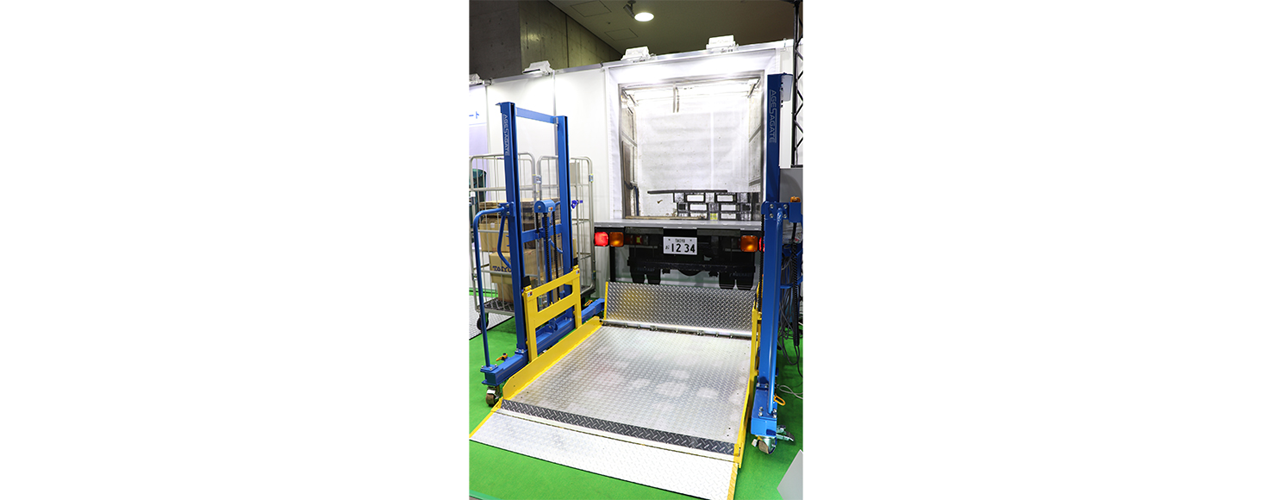 効率化のためだけでなく、高齢者や女性が現場に進出していることも省力化をしなければならない理由の一つだ。大阪タイユーは動力源を用いた省力化につながる製品を多数出展した。中でも初出展の10月発売予定のトラック荷役用リフター「AGESAGATE」はプラットフォームがない場所やフォークリフトが入り込めない場所、カゴ台車などフォークリフトでの搬送が難しいものの荷運びにも役立つ。