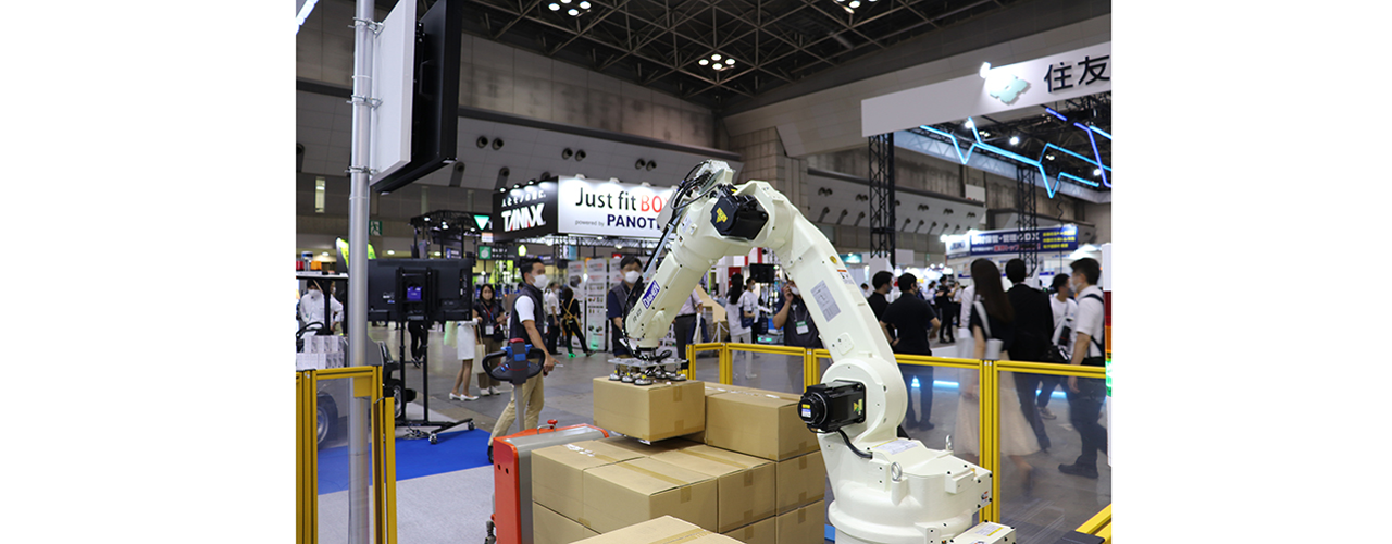 山善は「User Friendly ~働く人に優しい現場づくり~」をテーマに出展。ロボット×搬送ゾーンではパレタイザロボット「YZロボットPシリーズ」によるパレットへの段ボールの組み付けを実演した。周辺機器も含めパッケージ化することで価格を抑えた。自動搬送ソリューションゾーンではeve autonomyのゴルフカートをベースとした自動搬送EV「eve auto」を提案。屋外でも使用できるため、部材の建屋間搬送の自動化に貢献する。緊急停止した際の再起動も遠隔で行えるようになり、より使いやすくなっている。