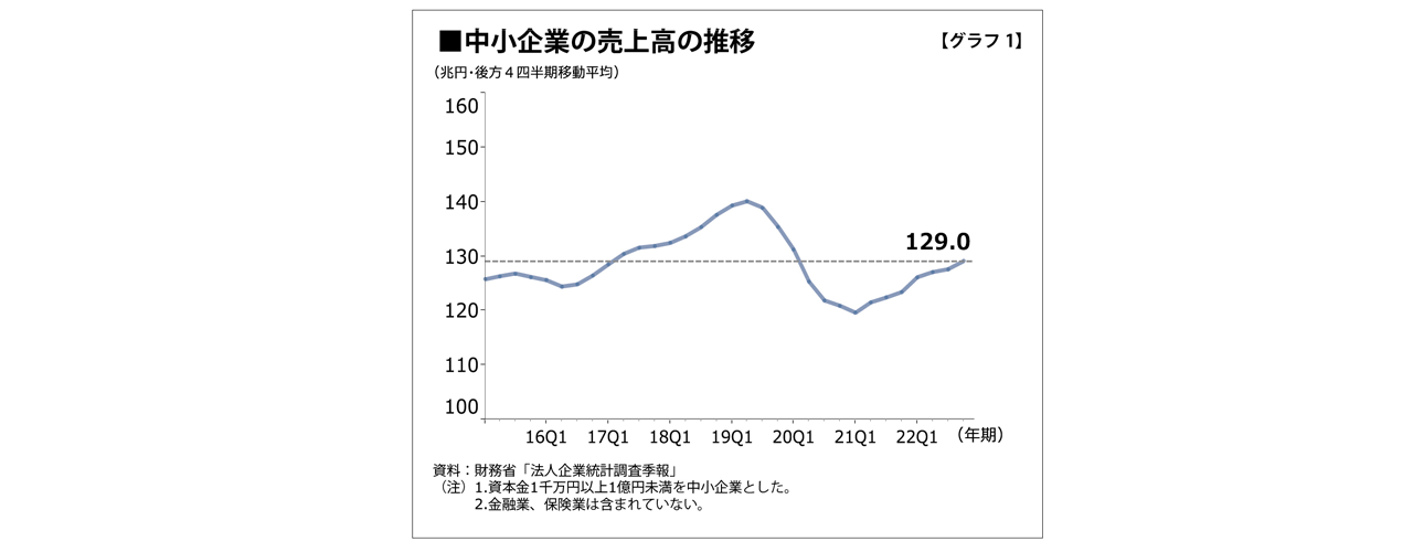 コロナ禍が収束傾向にあるなか、中小企業の売上高が感染症流行前の水準に戻りつつあることを、各種資料を添えて記している。しかし宿泊や交通など業種によっては厳しい現況もあり(現況とは今年2月頃までを捉えたものとみられる)、また稼働率等が業態によって異なっていること、同時に同じ業態のなかでも稼働率や回復力で差があることも触れた。