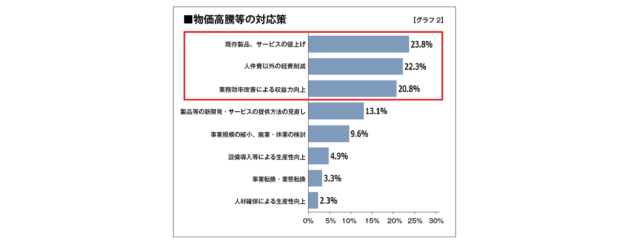物価高による収益減少の影響を認めながらも、中小企業における物価高騰(等の)対応策に目を向け「値上げだけでなく、経費削減や業務効率化による収益力向上などに取り組んでいる」とした。