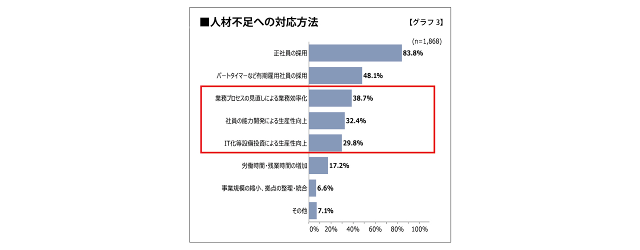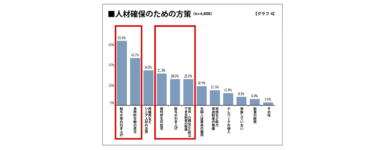また人手不足対策として「賃上げ」や「職場環境の改善」が重視されていたほか、従業員の多能工化に取り組む例もみられた。さらに子育て世代の休暇取得や勤務時間の短縮・変更など柔軟な働き方を実現することにより、離職率を大きく改善する例がみられた。
