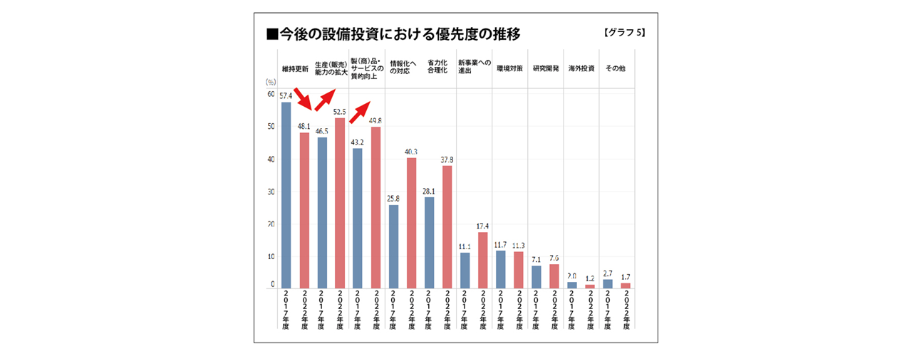 設備投資の目的を過去のアンケートと比較してみると、全体として「維持更新」が低下し、代わって「生産(販売)能力の拡大」、「製(商)品・サービスの質向上」を重視する傾向にあった。このほか、情報化や省力化・合理化を重視する割合が大きく高まっていた。