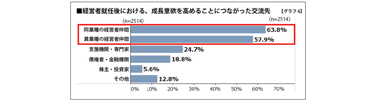 戦略の構想・実行に携わる経営者に目を向けると、傾向として「第3者の外部との交流が経営者の成長意欲を高めている」という。白書は今回、このあたりを特筆的に取り上げた。成長意欲を高めることにつながった交流先は複数回答で1位同業種の経営者仲間、2位異業種の経営者仲間、3位支援機関・専門家、4位債権者・金融機関と続いた。