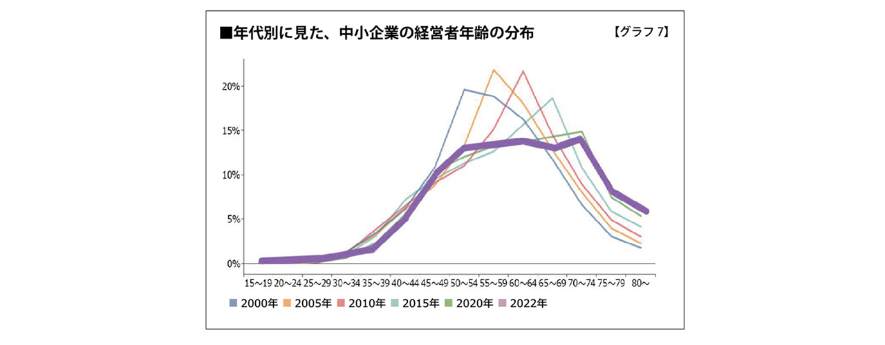他方、経営者の年齢を見ると、高齢化が進むなかにも、足下では経営者の年齢層の分散がみられ、「事業承継が一定程度進んでいる可能性」と捉えた。