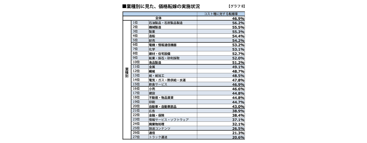 価格転嫁について、は中小企業庁のフォローアップ調査(2022年9月)で業種によって事情の異なっていることが明らかになっており、転嫁率は高い業種で56%、低い業種だと20%程度にとどまっていた。引き続き情報公開を通じて価格転嫁を促進させる考えにある。