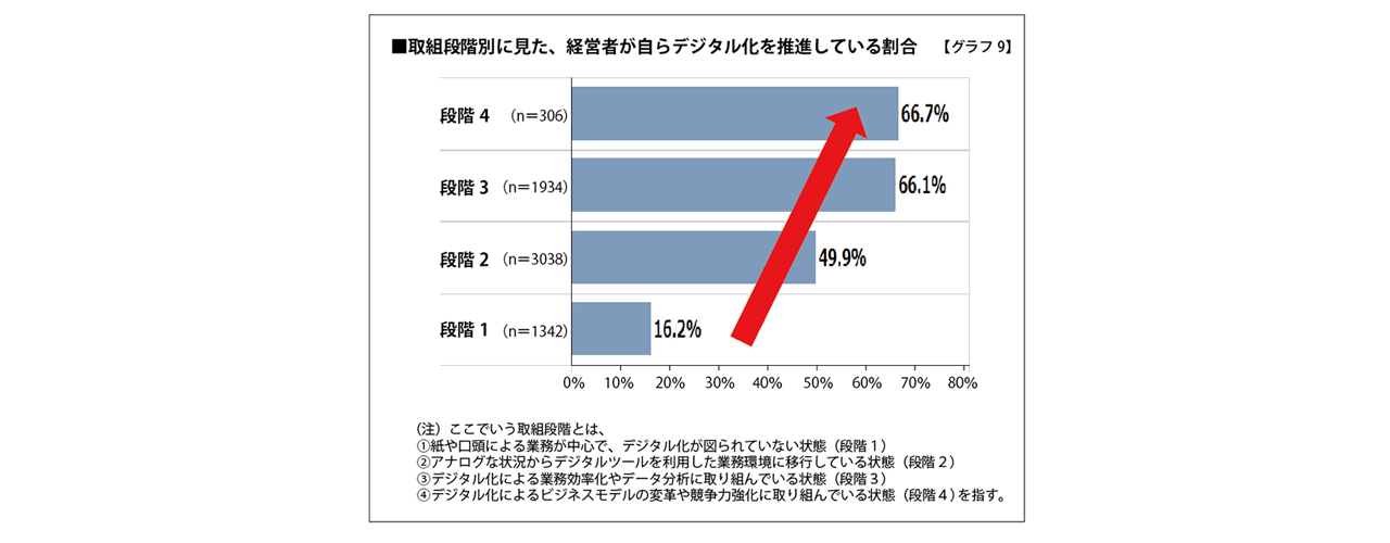 他方、共通基盤としてのデジタル化は感染症前と比べ進展が見られ、「デジタル化が進展している中小企業では、経営者自らデジタル化を推進しているケースが多かった」。