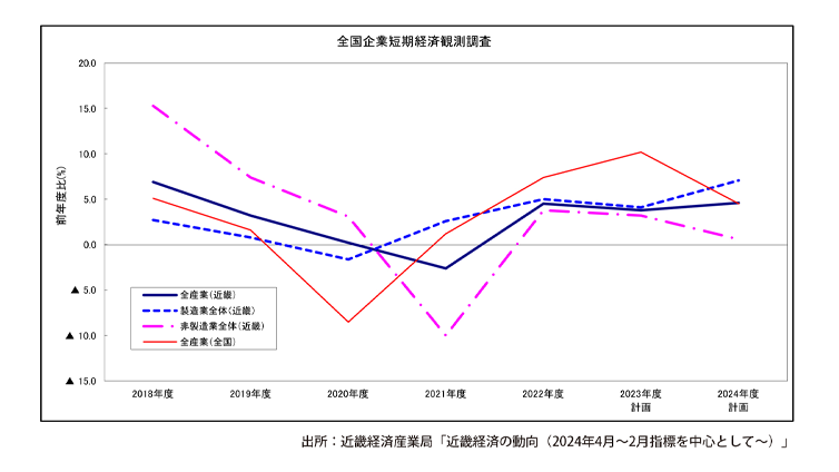 設備投資意欲も落ちていない。近畿経済産業局が4月19日に発表した近畿経済の動向(2月指標中心)によれば、近畿における24年度の製造業の設備投資計画の額は前年度比7.1増%と、全国(5.1%増)や前年度計画(4.1%増)をともに上回る水準だった。