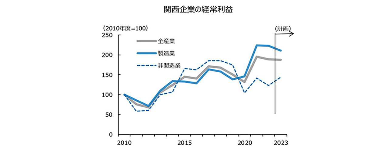 企業収益を日本銀行大阪支店の2023年3月の短観(全規模・全産業)でみると、関西企業の2023年度の売上・経常利益計画はそれぞれ前年度比0.9%増、同0.2%減と全体としてみれば前年度並みである。