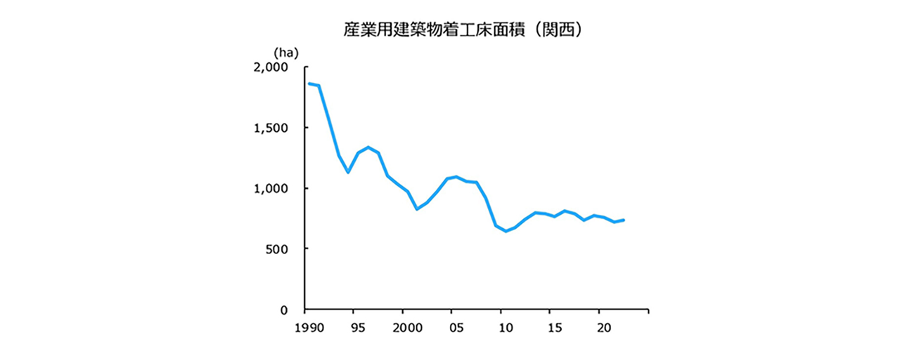さて、関西における産業用建築物の着工をみると、2010年度に底打ちし、その後は概ね横這い圏で推移している。