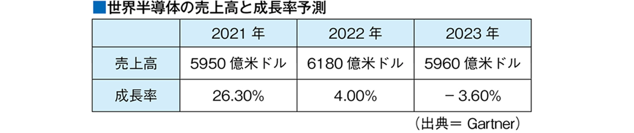 米調査会社Gartnerが昨年11月末に発表した世界半導体市場予測によると、2023年の世界半導体売上高は前年比3.6%減の5960億米ドルになると予想。同社の調査担当バイスプレジデント、リチャード・ゴードン氏は、「世界経済の急速な悪化と消費者需要の減退が2023年の半導体市場に悪影響を及ぼすだろう」と見通した。