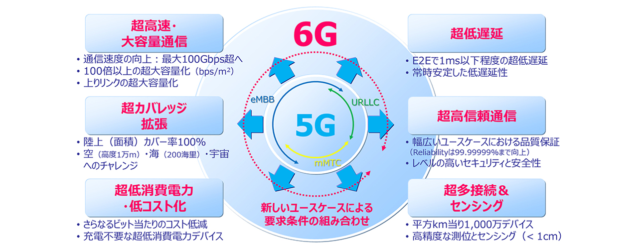 5Gの普及も道半ばではあるが、水面下では2030年以降の6G普及推進の動きも出ている。4Gに比べて6Gは約100倍の通信速度(5Gは4Gの10倍)で、「高速・大容量」、「低遅延」、「多数接続」なあらゆる面で5Gの性能を上回る。また空、海、宇宙への通信エリア拡大や超低消費電力低コスト通信の実現を目指している。