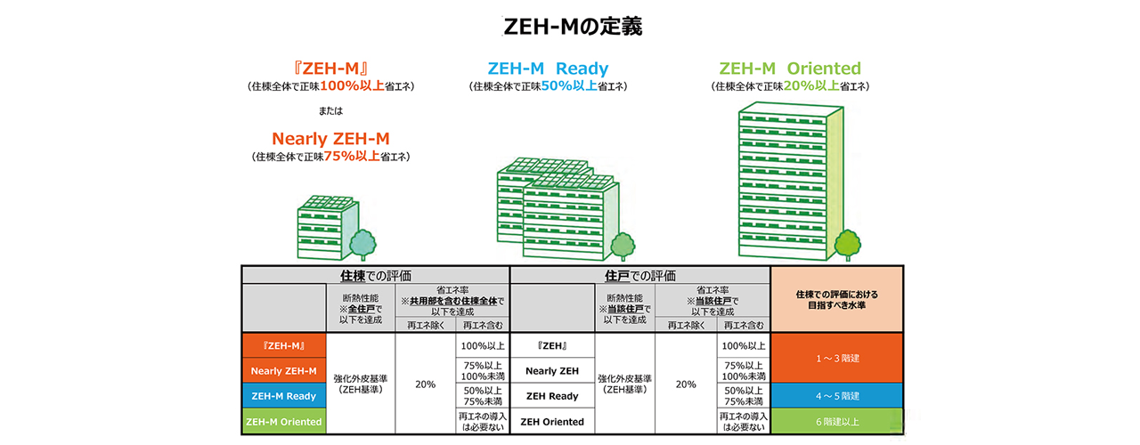 脱炭素化社会の実現に向け、産業・民生部門問わずさまざまなアプローチが加速している。住宅業界では、住宅性能を向上させ年間の一次エネルギー消費量を正味ゼロにするZEHの普及に取り組んできた。そのなかで集合住宅の超高層ZEH-M(ネット・ゼロ・エネルギー・ハウス・マンション)の浸透に力が入れられる。ZEH-Mでは達成段階によって、『ZEH-M』、Nearly ZEH-M、ZEH-M Ready、そしてZEH-M Oriented(図表参照)と定義を制定。集合住宅では高層化にともなって太陽光発電設備を設置する屋上面積が限られ、創エネで住宅全体のエネルギー消費量をまかなうのが困難になることを考慮した定義となっている。