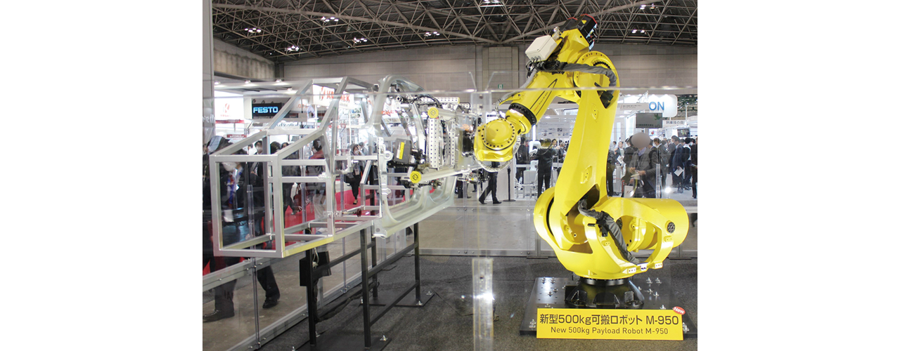 ファナックはギガキャストの広がりを意識し、500kg可搬の「M-950」を用意する。このクラスで背面に2本見られるアームを1本にしたシリアルリンク機構を採用し、「可動範囲を2.5〜3倍に広げ周辺機器との干渉を避けられる」特長をもたせた。昨年12月に開かれた国際ロボット展ではラックにかかった、揺れ動く自動車サイドパネルをビジョンセンサーでその傾きを把握して掴んで運び、設置する様子を見せた。