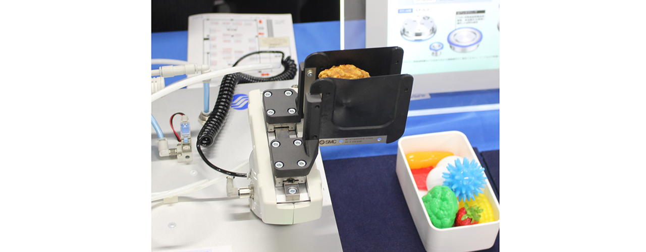 機能強化が進む周辺機器にも目を向けたい。(一社)日本ロボットシステムインテグレータ協会が2月28日、ロボットSIer向けに都内で開いた新製品説明会で、空圧機器メーカーのSMCはアーム先端に取り付ける空圧式グリッパー「弾性フィンガ」を紹介した。形が不揃いの対象物を薄いゴムまたはシリコンの板2枚で両側から挟んで掴む。「マカロンや唐揚げ、多様なサイズがあるPETボトルなどを確実にキャッチする。協働ロボットでも産業用ロボットでも専用装置でも使える」と言う。板は約80mm角の大きさだが、「今後4種ほどにサイズを増やし、リンゴやスイカも掴めるようにする」と意気込む。