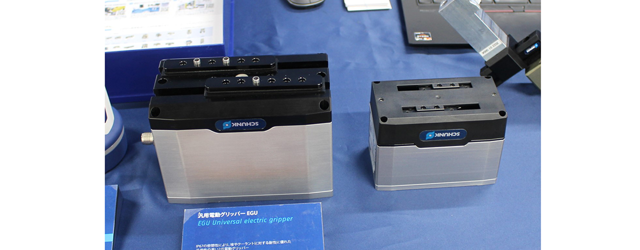 シュンクが昨春発売した電動グリッパー「EGU」(ヘビー用)、「EGK」(ソフトグリップ用)は動きの速さ・状態・トルクを柔軟に制御できるのが特長。グリッパーはサーボモーターと減速機を内蔵し、「電気と通信の線をロボットにつなげばロボット側のプログラム内容がグリッパーに伝わる」と言う。
