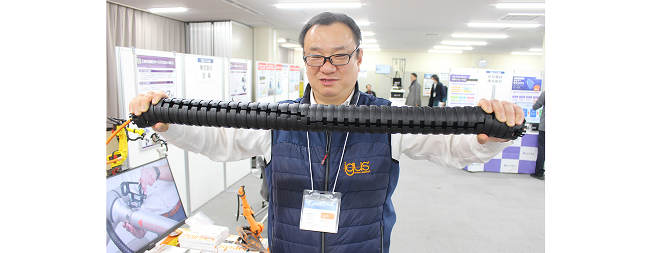 ケーブル保護管が進化を遂げた。イグスが今年発売した「TRX」(外径65mm)は伸縮し、最大36%の長さ補正が可能だ。同社は「ロボットアームの回転などによりケーブルが余って垂れ下がり、動きを干渉することがある。巻き取り機構をアームに背負わせることもあるが、それ自体が邪魔になる」と開発の背景を話す。保護管の伸縮は簡単そうに思えるが、内部のケーブルも同じように伸び縮みする必要がある。そこでケーブルをスパイラル状に管内に納め、ケーブルが伸びる際には直線形状になるように管がひねる動きをするようにした。