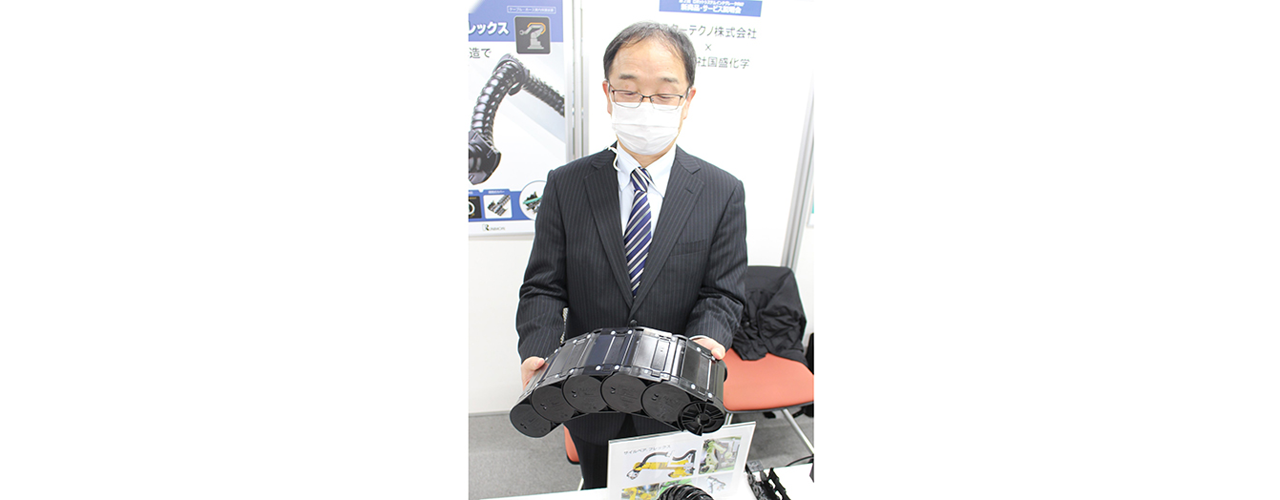 激しく動いても音を出しにくい保護管もある。国盛化学のケーブルチェーンはリンクレス(繋ぎ目のない)構造としたことで滑らかに動いて振動を抑え、音・摩耗・発塵を発しにくい。