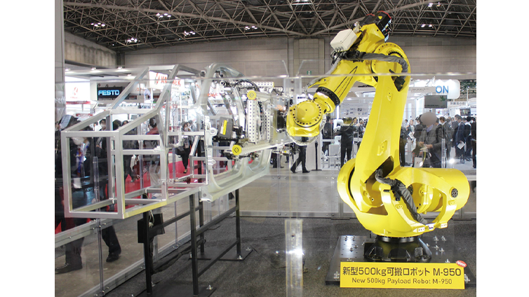 ファナックはギガキャストの広がりを意識し、500kg可搬の「M-950」を用意する。このクラスで背面に2本見られるアームを1本にしたシリアルリンク機構を採用し、「可動範囲を2.5〜3倍に広げ周辺機器との干渉を避けられる」特長をもたせた。昨年12月に開かれた国際ロボット展ではラックにかかった、揺れ動く自動車サイドパネルをビジョンセンサーでその傾きを把握して掴んで運び、設置する様子を見せた。