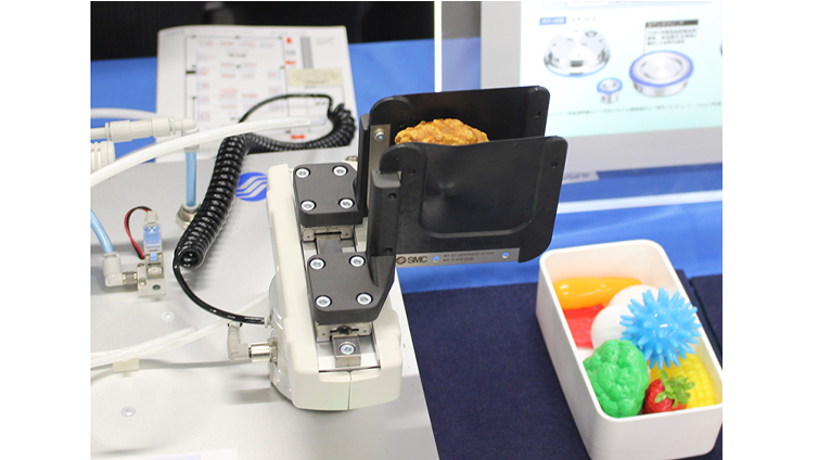 機能強化が進む周辺機器にも目を向けたい。(一社)日本ロボットシステムインテグレータ協会が2月28日、ロボットSIer向けに都内で開いた新製品説明会で、空圧機器メーカーのSMCはアーム先端に取り付ける空圧式グリッパー「弾性フィンガ」を紹介した。形が不揃いの対象物を薄いゴムまたはシリコンの板2枚で両側から挟んで掴む。「マカロンや唐揚げ、多様なサイズがあるPETボトルなどを確実にキャッチする。協働ロボットでも産業用ロボットでも専用装置でも使える」と言う。板は約80mm角の大きさだが、「今後4種ほどにサイズを増やし、リンゴやスイカも掴めるようにする」と意気込む。