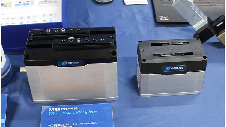 シュンクが昨春発売した電動グリッパー「EGU」(ヘビー用)、「EGK」(ソフトグリップ用)は動きの速さ・状態・トルクを柔軟に制御できるのが特長。グリッパーはサーボモーターと減速機を内蔵し、「電気と通信の線をロボットにつなげばロボット側のプログラム内容がグリッパーに伝わる」と言う。