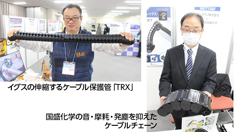 ケーブル保護管が進化を遂げた。イグスが今年発売した「TRX」(外径65mm)は伸縮し、最大36%の長さ補正が可能だ。同社は「ロボットアームの回転などによりケーブルが余って垂れ下がり、動きを干渉することがある。巻き取り機構をアームに背負わせることもあるが、それ自体が邪魔になる」と開発の背景を話す。保護管の伸縮は簡単そうに思えるが、内部のケーブルも同じように伸び縮みする必要がある。そこでケーブルをスパイラル状に管内に納め、ケーブルが伸びる際には直線形状になるように管がひねる動きをするようにした。
