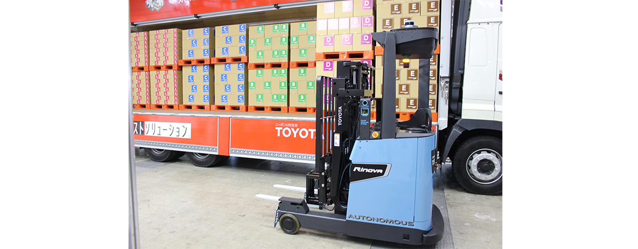 豊田自動織機が実演した電動フォークリフト。自動運転でトラックからパレットを運び出す(9月14日、国際物流総合展)