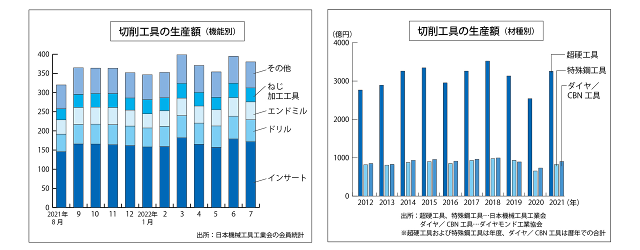 切削工具の生産額は月間350億円強を維持し堅調に推移している。昨年7〜12月の半年間の累計額は2125億7500万円で前年同期に比べると38.0%も増えた。今年1〜6月の累計額は同11.6%増の2212億5000万円と、さすがに伸び率は鈍化したが2ケタ成長を維持する(日本機械工具工業会の会員統計)。