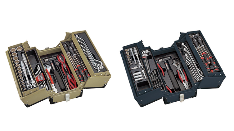 TONEはアウトドアを意識したカーキとインディゴカラーのツールセットを展開。信頼の同社工具を収めたツールボックスは、コーナー部分がブラックカラーのガードで覆われており、ツールボックスそのものの強度を向上させるとともに、剛性感の高い外観となっている。また持ち手部分のハンドルを倒すと天面がフラットになるので、収納時に荷物を重ねたり、座ることも可能にしている。工具の内容は、オートメカニック用とメンテナンス用を用意。作業に合った選択を可能にしている。