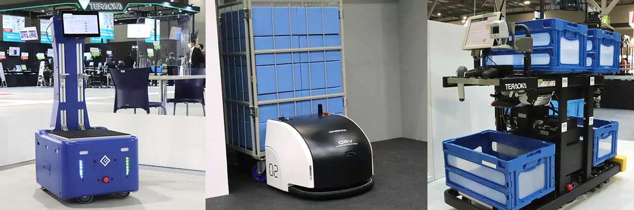 ORVの特長として担当者が挙げるのが、搭載された画像認識カメラです。カゴ車の位置や向きを認識することで「カゴ車位置がある程度ラフでも自動搬送できる」そう。「カゴ車を使うユーザーは多く、工場や物流センターだけでなく将来的には小売店などでの品出しにも活用いただけると考えている。未発売だが問い合わせも多く、夏ごろに正式リリースできるよう最後の詰めを行っている」(担当者)。そのほか、マスターレスで多彩な形状の商品をピッキングできるロボットピースピッキングシステム「Right Pick」にも注目が集まりました。