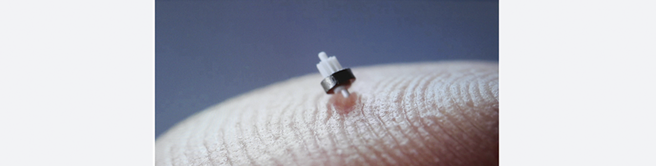 指先に載る樹脂製ギア。マグネットを金型にセットしてから一体成形される。