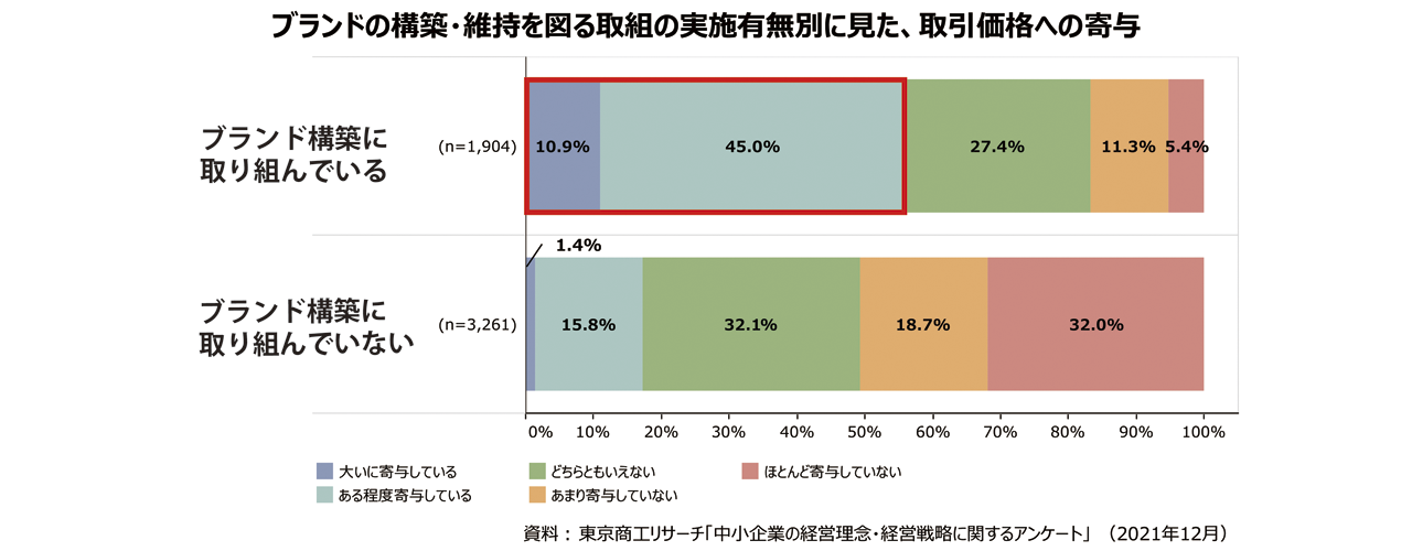 このグラフは企業のブランドが取引価格の引上げ・維持に寄与しているかどうか聞いたものだが、ブランド構築に取り組んでいる企業の約56%が「大いに寄与している」ないし「ある程度寄与している」と回答したのに対し、取り組んでいない企業は同割合が17%程度に過ぎなかった。