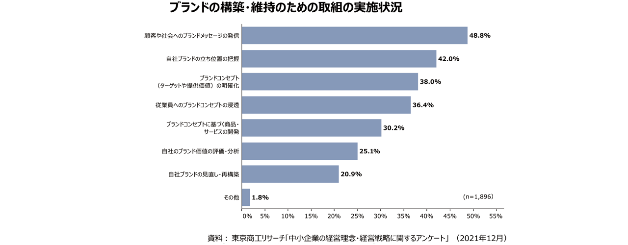 他方、ブランドの構築・維持のための活動では、自社ブランドの発信だけでなく、ブランドコンセプトの明確化や従業員への浸透などを行うことも必要ということが別の問いで浮き彫りになった。